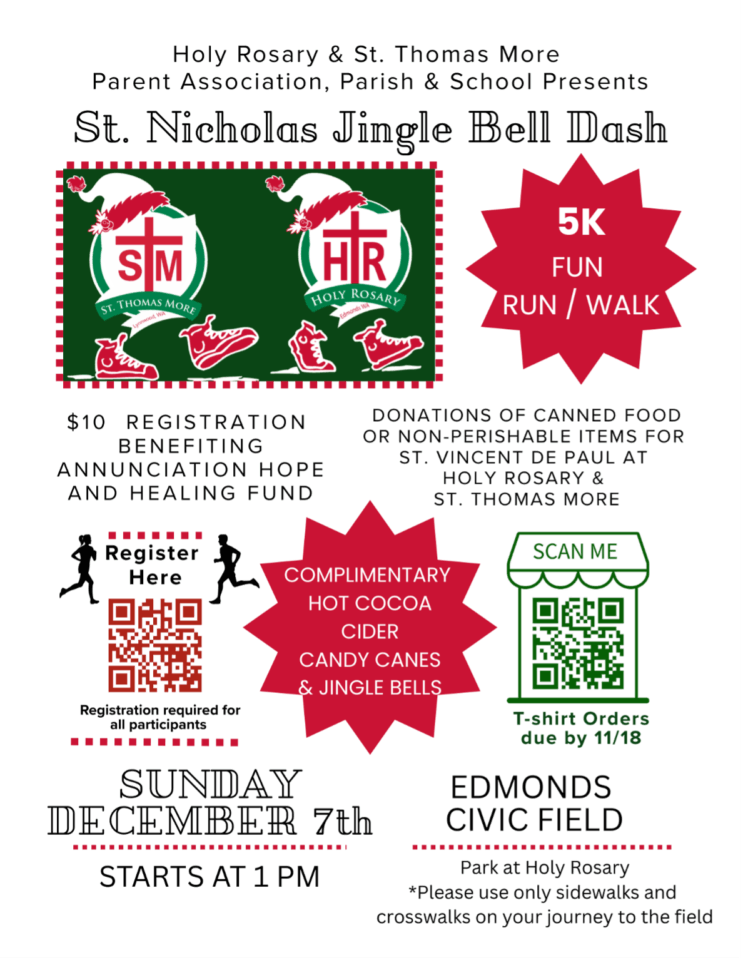 Come get into the holiday spirit and run the St. Nicholas 5K Jingle Bell Dash hosted by Holy Rosary (Edmonds) and St. Thomas More (Lynnwood) schools on Sunday, Dec. 7 starting at 1 p.m. The Jingle Bell Dash will start at Edmonds Civic Field. Suggested registration amount is $10 per person, and money raised benefits the Annunciation Hope & Healing Fund.