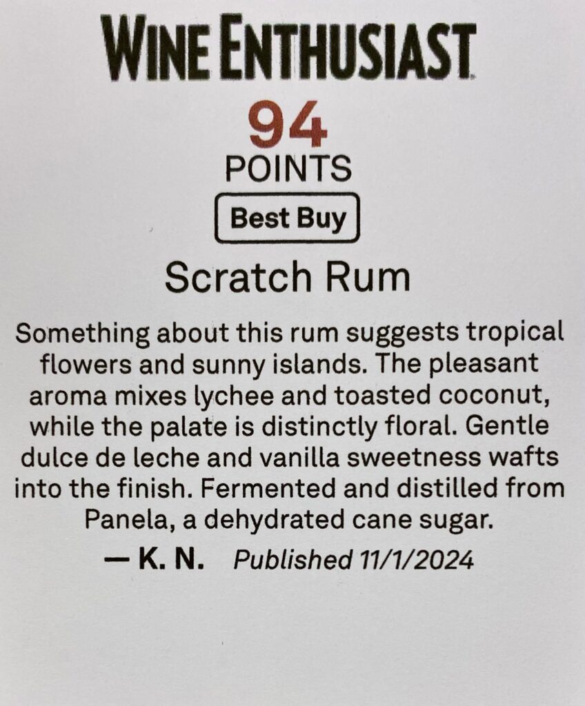 Exciting news: Wine Enthusiast magazine doesn’t just review wines — they also celebrate outstanding spirits. We’re thrilled to share that they have featured Scratch Rum in their November 2024 Top 100 Best Buys. This is our very first submission for their review, and we couldn’t be more grateful for their recognition. Thank you, Wine Enthusiast, for appreciating our craft. Cheers to more adventures in sipping.