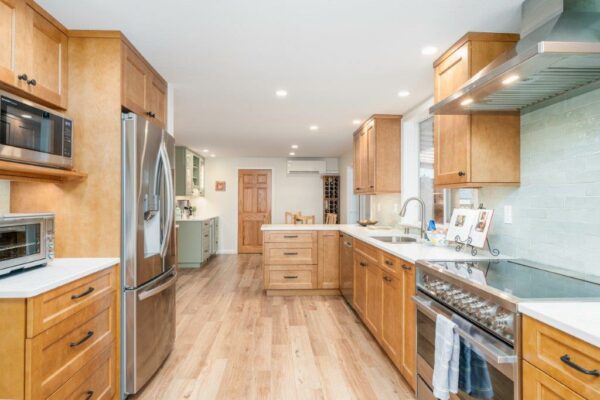 This beam installation was not ordinary. The complexity of the loads from the second floor and the first floor’s adjacent staircase and bathroom were tricky to work around. The beam installation required custom engineered hardware to allow plumbing penetrations into the bathroom. Additionally, the existing covered deck required custom exterior soffits to accommodate 10-inch ducting for the new range hood.