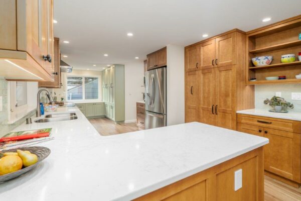 This family’s crowded house was in dire need of a major upgrade. The parents were aging, changing their priorities. Functionality and lighting topped their list. Their teen children were now cooking meals and baking too! Of course, the whole family desired additional storage, a workstation and a place to serve/store pet food.