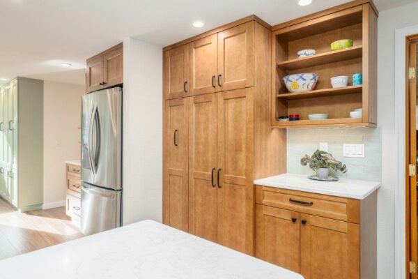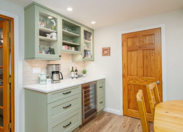 The prior pantry was insufficient, both in size (cabinet depth) and function. This area was revamped by adding a combination of drawers and floor to ceiling cabinets to contain their food staples and crafting materials. Adjacent to the built-in sage wall cabinetry is a seating area with room for a slide-out bench. Their kids use this space for schoolwork and sewing, while the pet food is stored nearby.