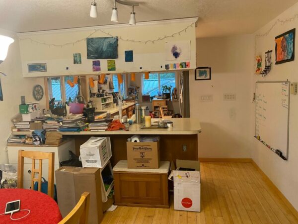 The illusion of spaciousness was created by manipulating the cabinetry design. The area has multiple doorways from the laundry room, into the living room, to the bathroom, and the home office. Every walkway was taken into consideration to minimize bottlenecks and congestion. The doors to the backyard deck were salvaged and designed around. They let light in and provide access to their hens, about a dozen who roam freely out back. During construction, the flock caused some ruckus for our team, even biting the gentlest team member.
