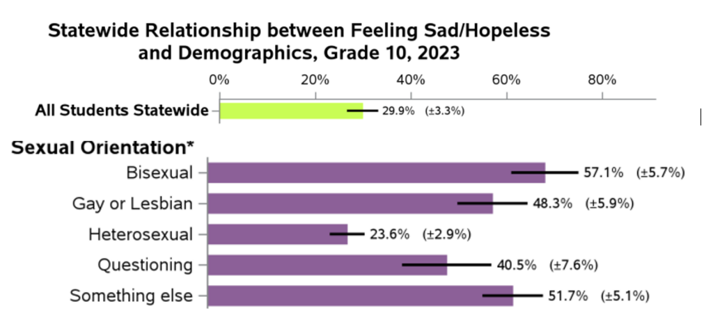 According to the 2023 Washington State Healthy Youth Survey, 29% of 10th graders in Snohomish County felt so sad or hopeless for two weeks or more that they stopped doing their usual activities — and 63% felt nervous or anxious in the past two weeks. So, almost one in three 10th graders in this community felt so hopeless, it impacted their activities. Even more unsettling is that almost half of those Snohomish County 10th graders surveyed who identify as gay, lesbian or bisexual report feeling hopeless. In fact, across the entire state of Washington, 10th graders who identify as anything but heterosexual are almost twice as likely to feel a sense of hopelessness than their heterosexual peers.