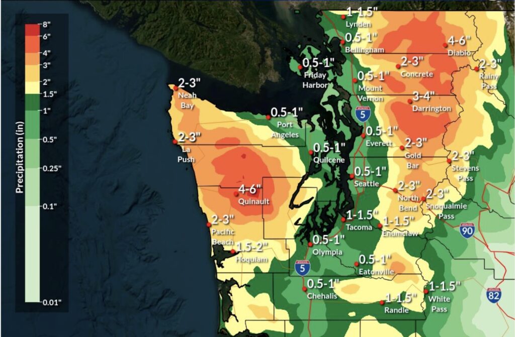 Reid Wolcott, the warning coordination meteorologist for the National Weather Service in Seattle, said 4 to 7 inches of rain could be in store for parts of the Cascades, which could fuel more river flooding. Strong winds, with gusts up to 45 to 50 mph, could also sweep into the region over the next day or two, he said, posing a risk of toppled trees and power lines.